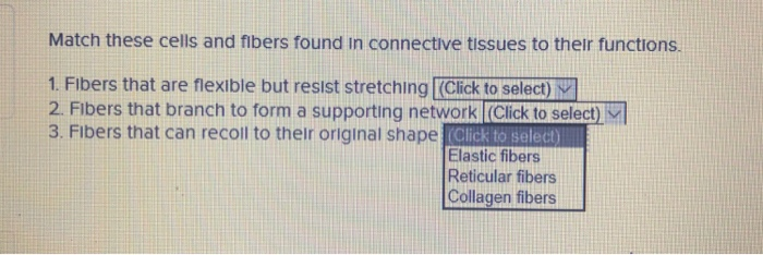 Fibers that branch to form a supporting network Click to select M 3. Elastic fiber contains the protein elastin along with lesser amounts of other proteins and glycoproteins. Strech easily and are resilient.